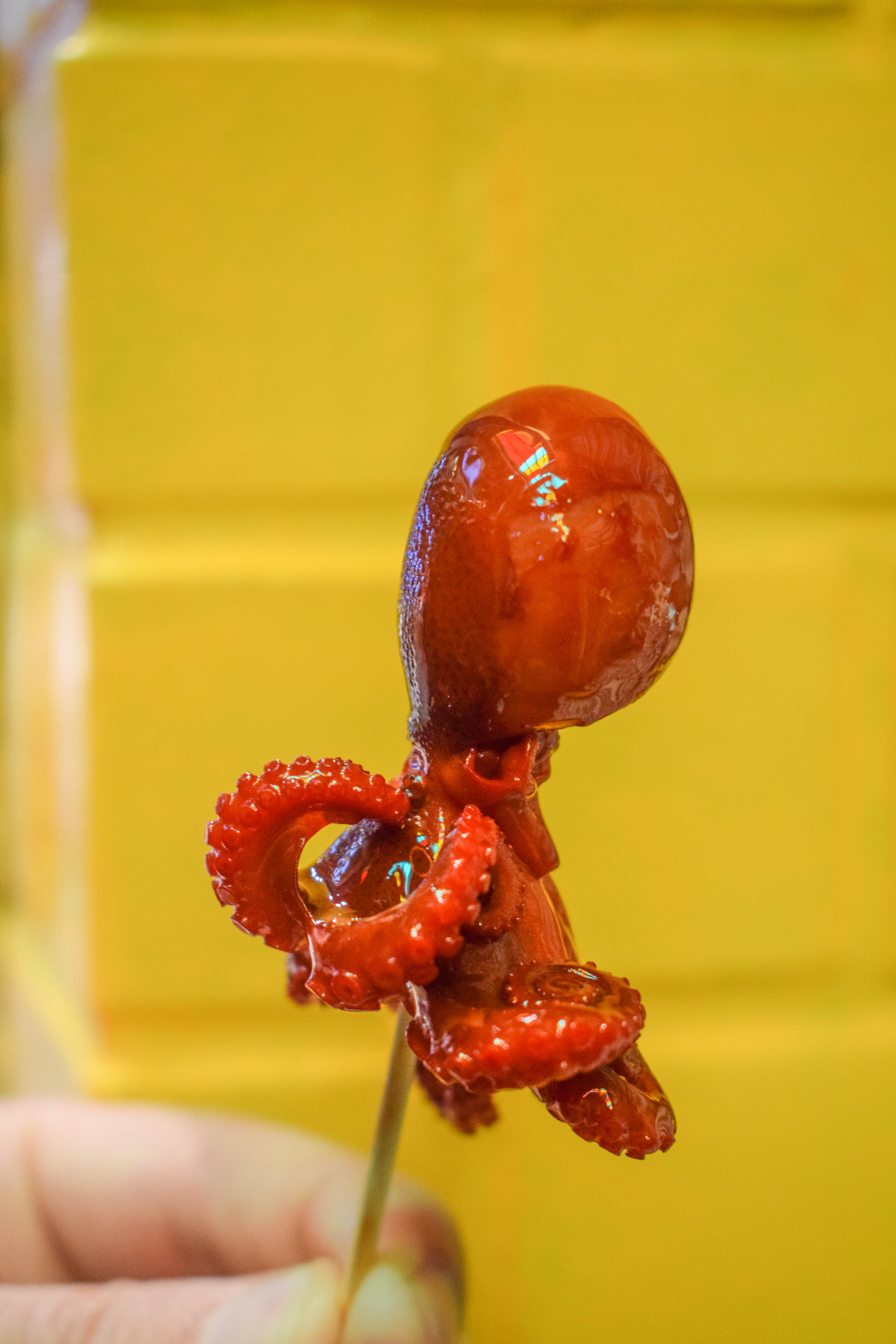 This was probably the strangest thing we ate in Japan. As you can see, Sasha was quite skeptical, but boy, was it delicious! You can just pop the whole thing in your mouth or eat it in two bites, and it has a sweet taste without being too chewy. The hard boiled egg inside the head is the best part!