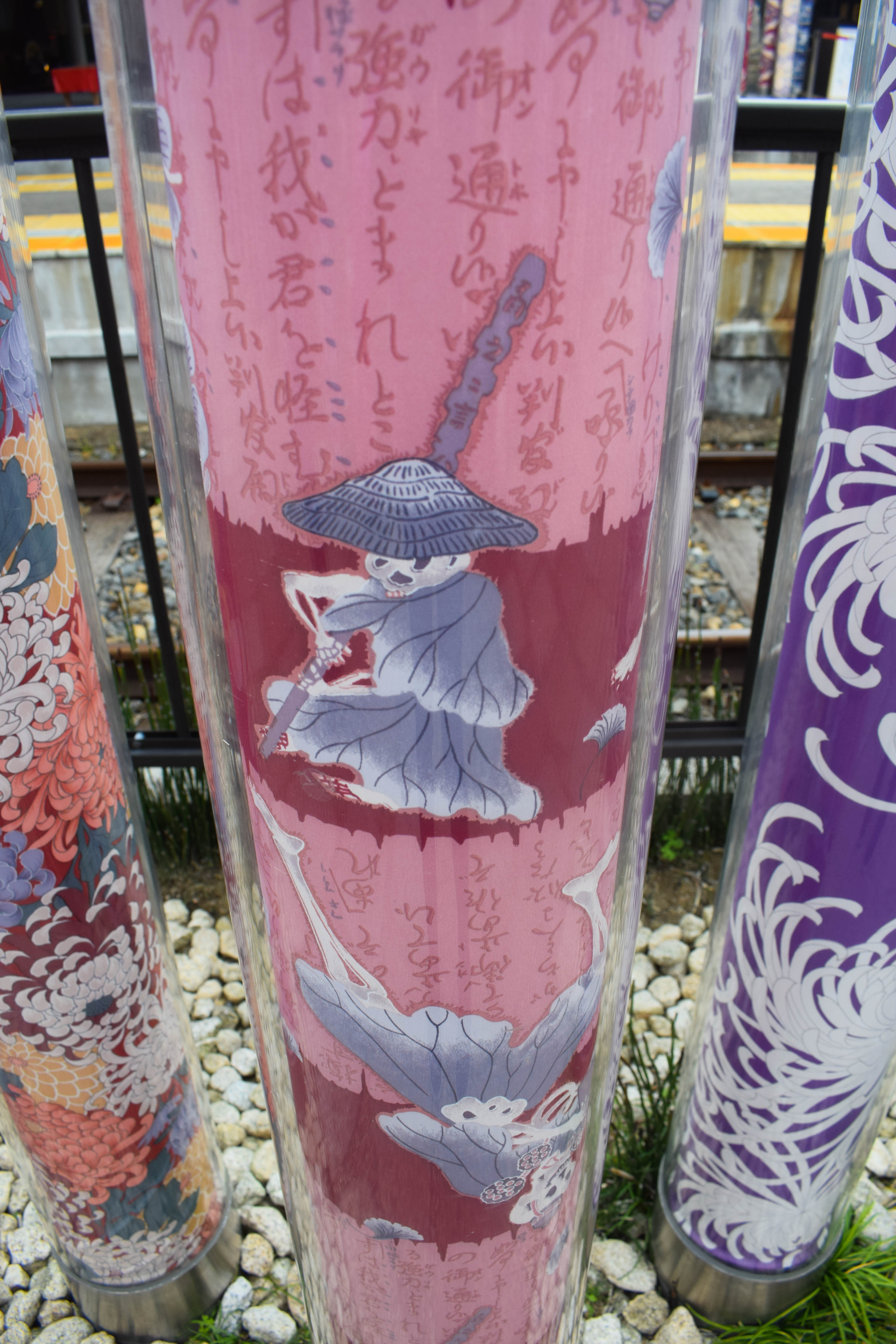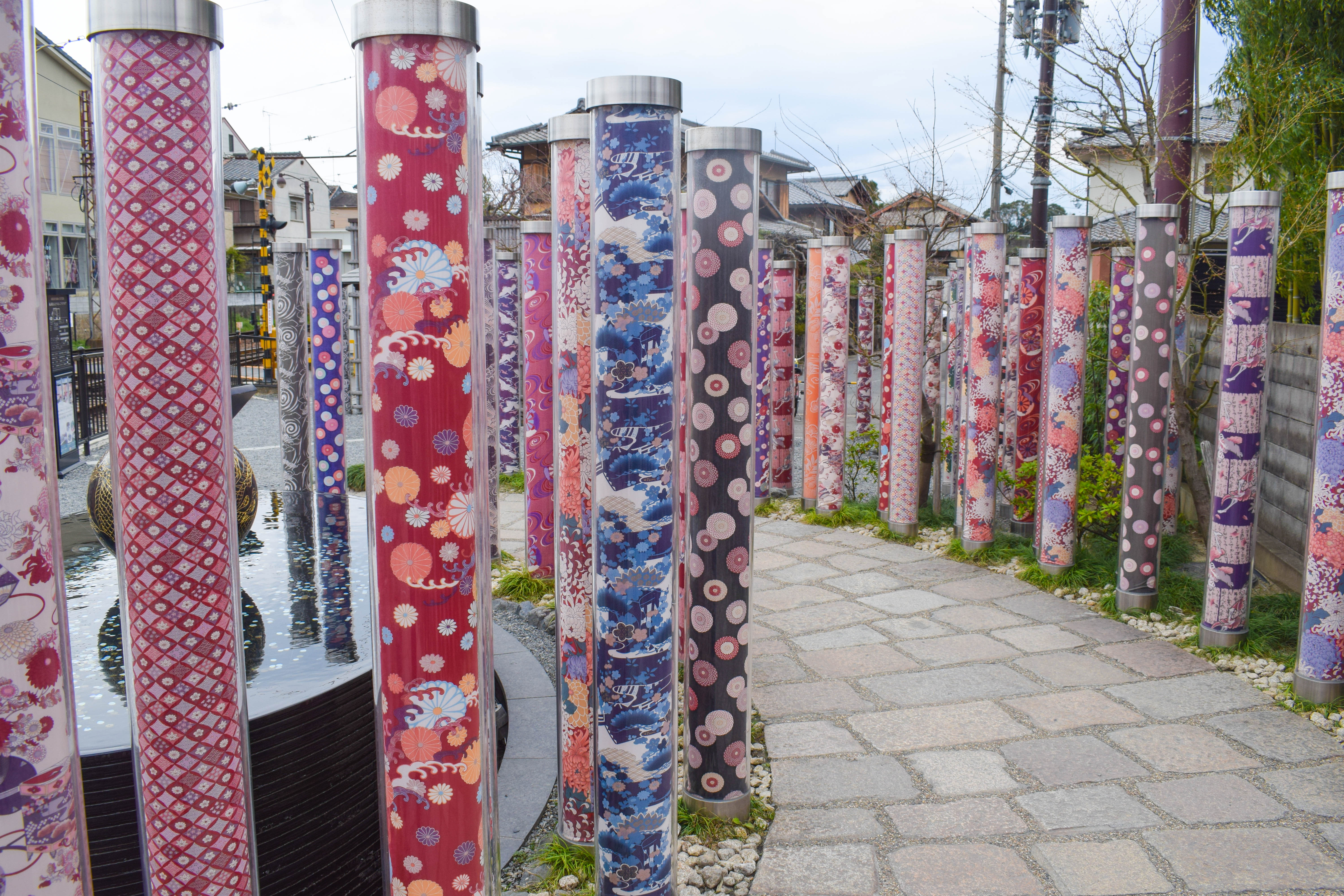 This beautiful installation of pastel-colored kimono wrapped inside tall plastic tubes, can be found at the Arashiyama train station.