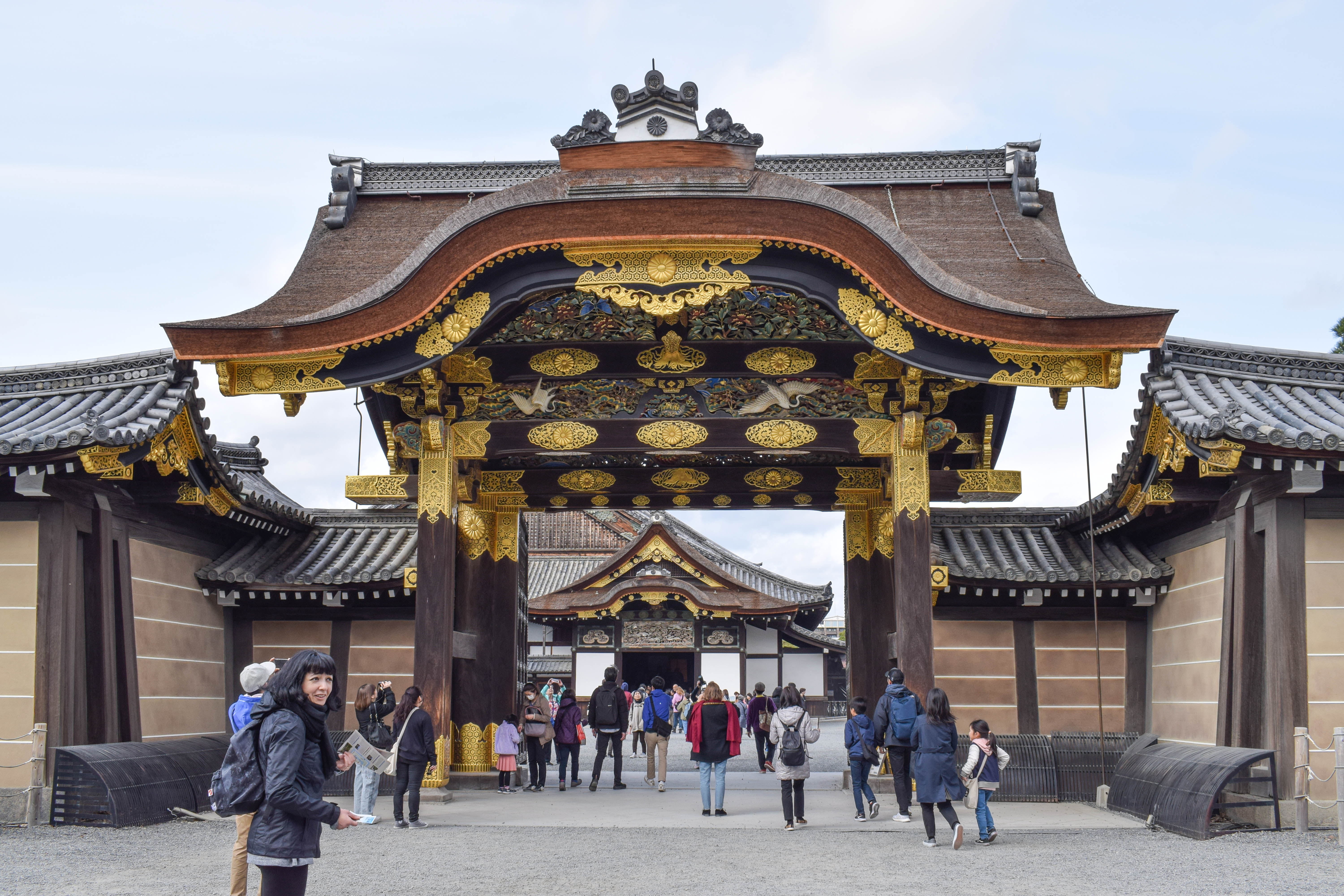 The Nijo Palace was built at the beginning of the Edo period in 1603 by the Shogun who brought 130 years of civil war to an end. The palace served as the Shogun residence during visits to the Imperial Capital of Kyoto. The emperor would visit, but he had his own private residence in a different location. When you walk on the floors, you will hear the wood squeak; this was intentional to detect assassins and prevent them from attacking. Each samurai has a family crest on the back of their kimono as well as on the sleeves. There are 6,000 family crests left in Japan from the samurai period. Shoes must be removed while inside, and no photography is allowed inside the castle.