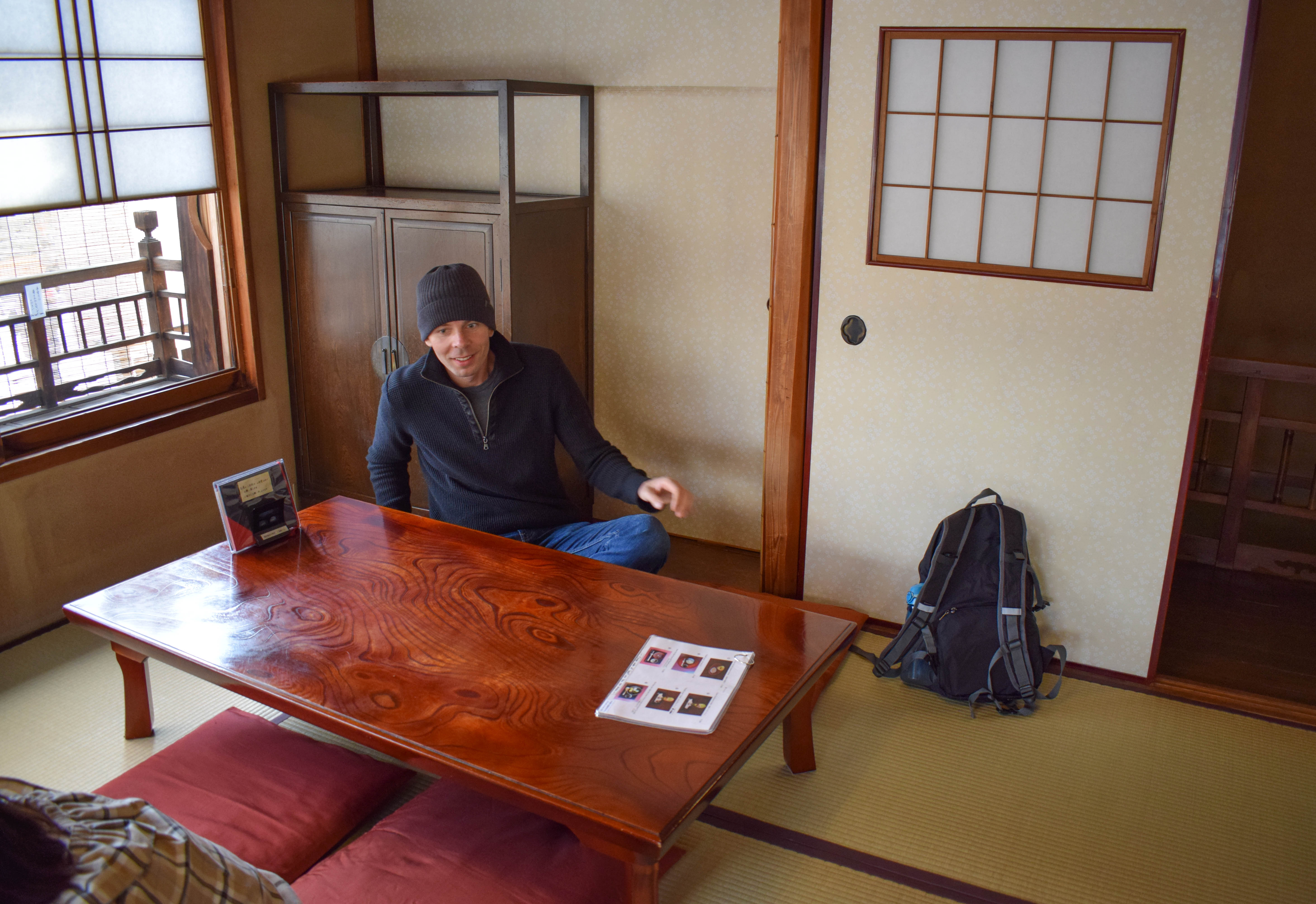 We visited a tea house with the traditional tatami mat seating, but the prices were very expensive because this is a tourist district. Poor Sasha had a hard time getting into the tatami mat seats because he’s so tall and leggy. 🙂