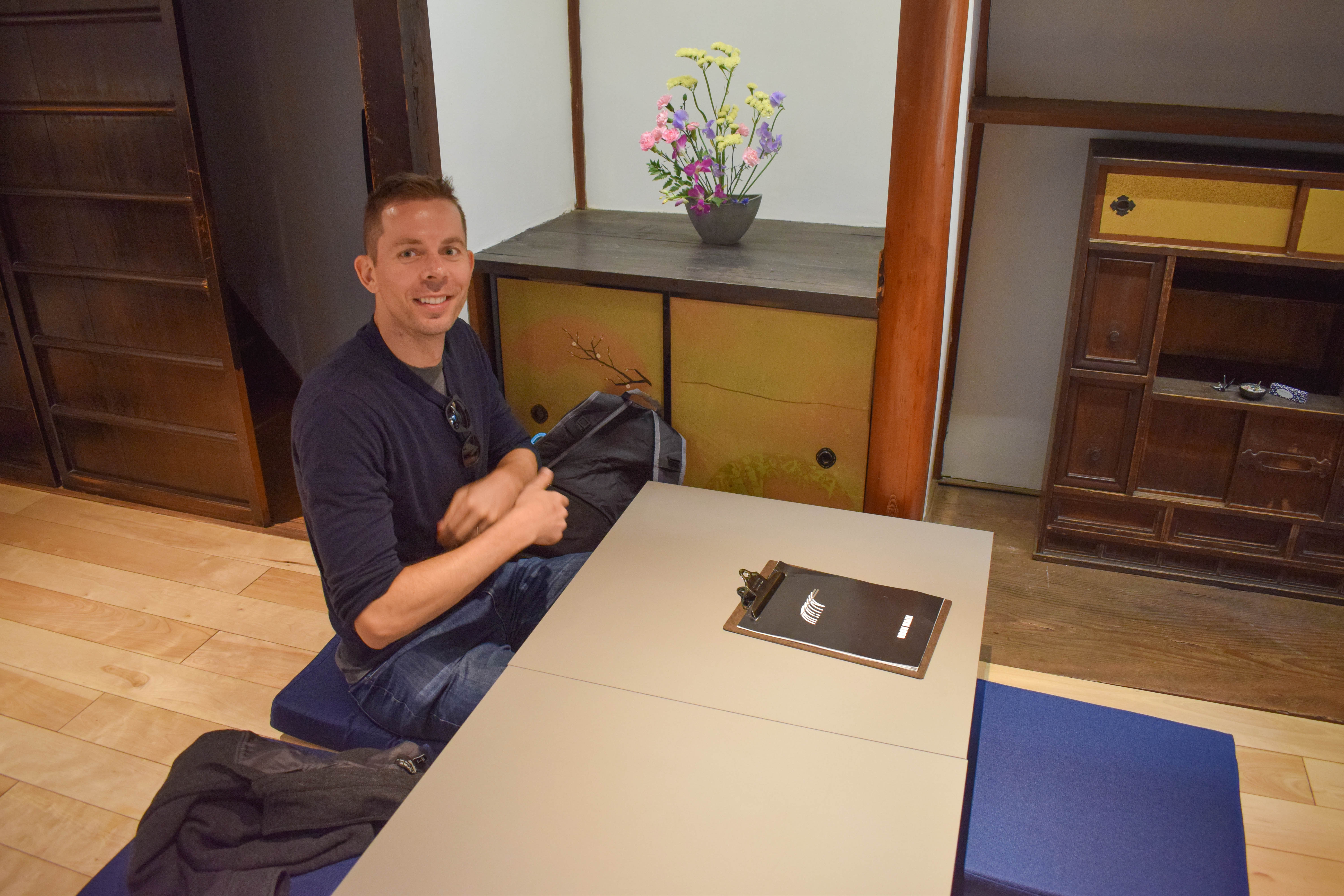 We visited a tea house with the traditional tatami mat seating, but the prices were very expensive because this is a tourist district. Poor Sasha had a hard time getting into the tatami mat seats because he’s so tall and leggy. 🙂