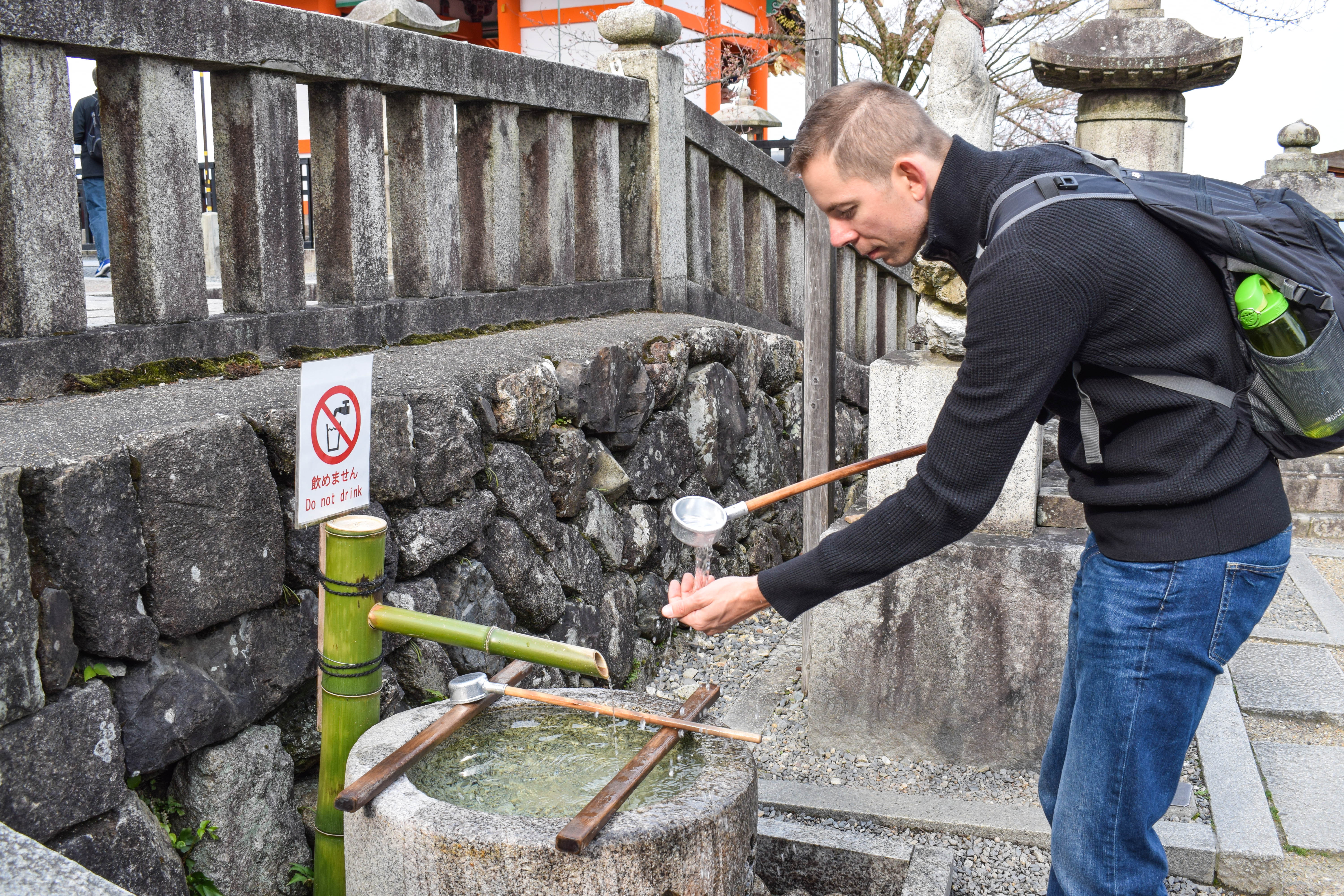 The main temple was under construction when we went, but it was still worth it to walk the grounds. It is common practice to cleanse yourself prior to entering any shrine in Japan. Here is the proper way to do it: