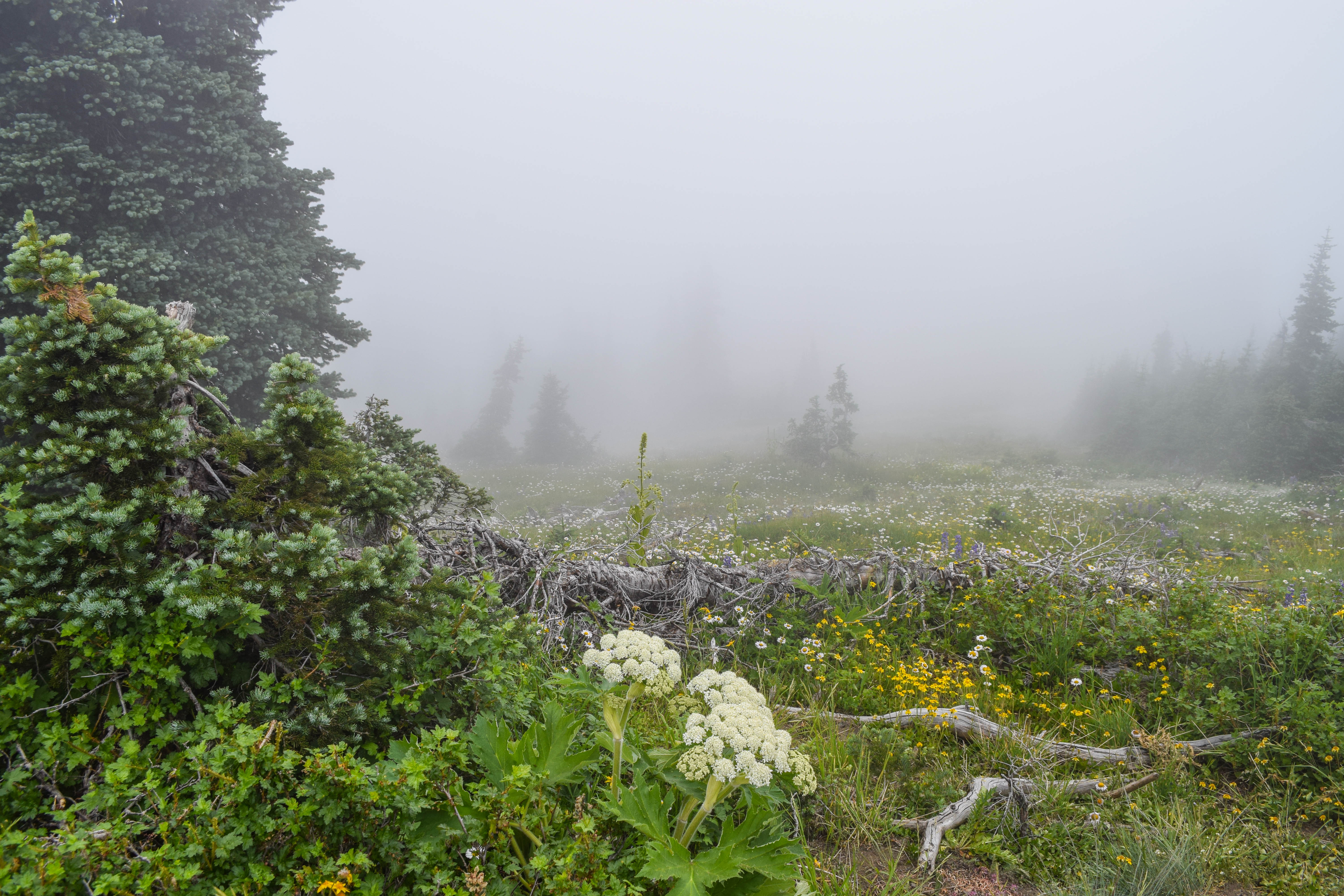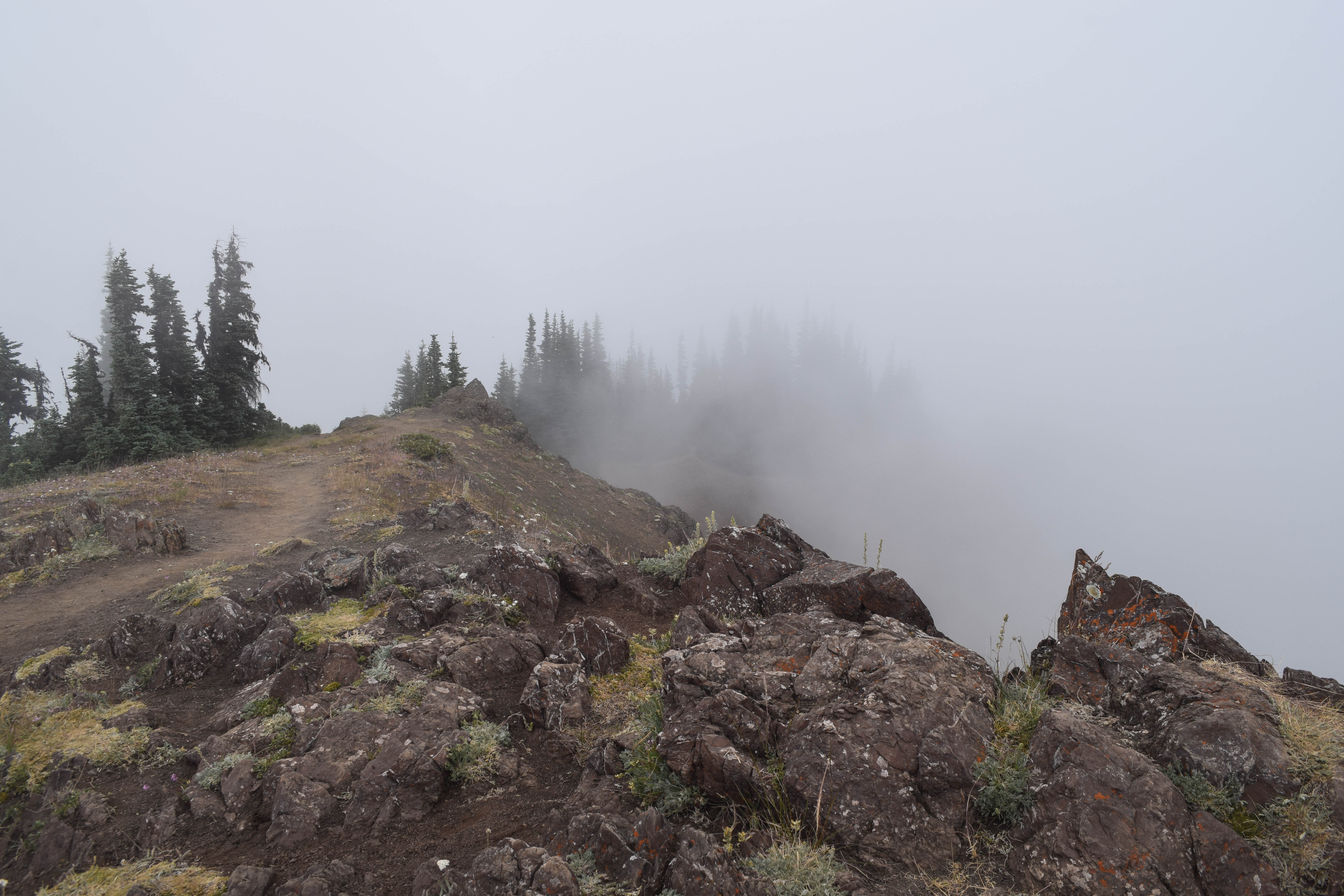 A little over a one-hour drive from Port Angeles is Blue Mountain, elevation 6,000′ (2,000 meters) and usually above the clouds. On a clear day the views are supposedly fantastic. We hiked on a foggy day, which made it even more interesting! Deer Park is also an excellent camping site with very few people and no facilities, only “faciliTREES”. 🙂 Actually there is one toilet up on the summit.